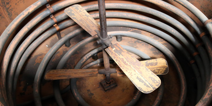 - The large cask and heated coils used to cook down the Mosto Cotto